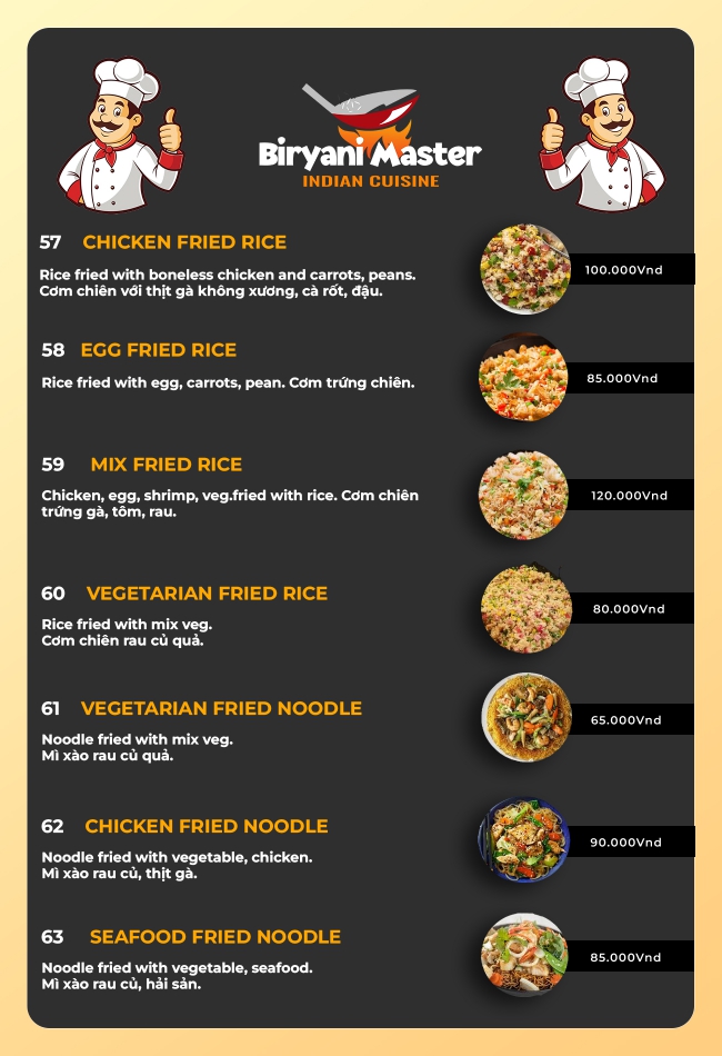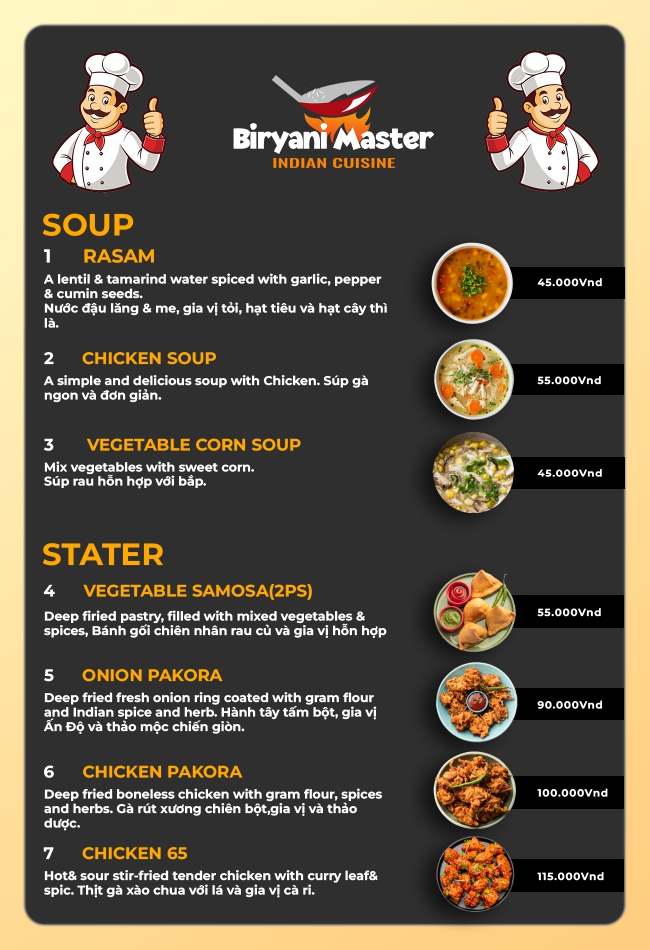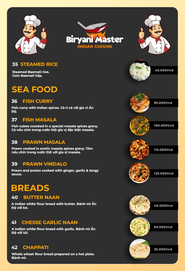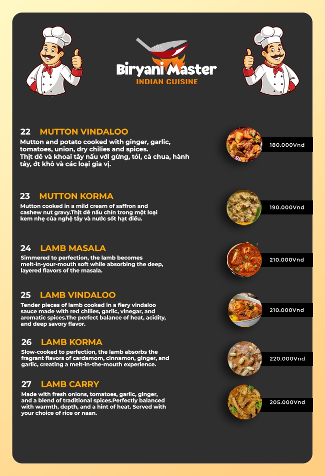At Biryani Master Insian Cuisine, we bring you the finest halal-certified dishes inspired by India, Bangladesh, and Vietnam. Enjoy premium dining with authentic flavors, cozy ambiance, and world-class service — right here in Vung Tau.